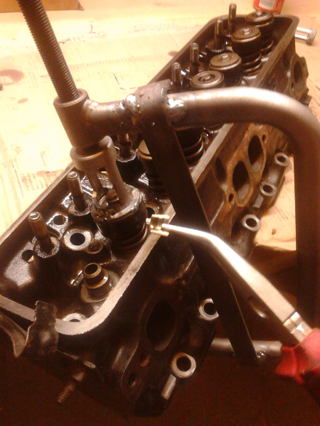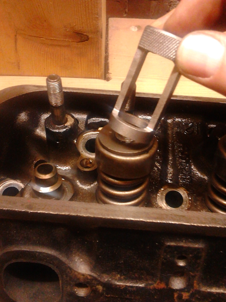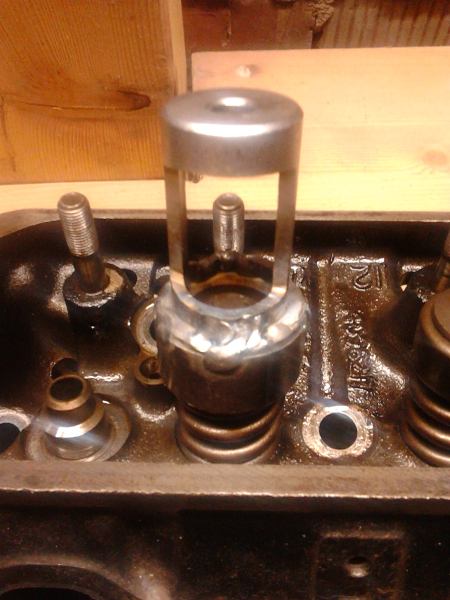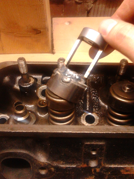 It turned out to be a bad decision, cause the spring caps were to small for the Chevy valve springs and the bail was not stable enough to compress the valves. At the end I had a bend bail. Now it was time for some modifications…